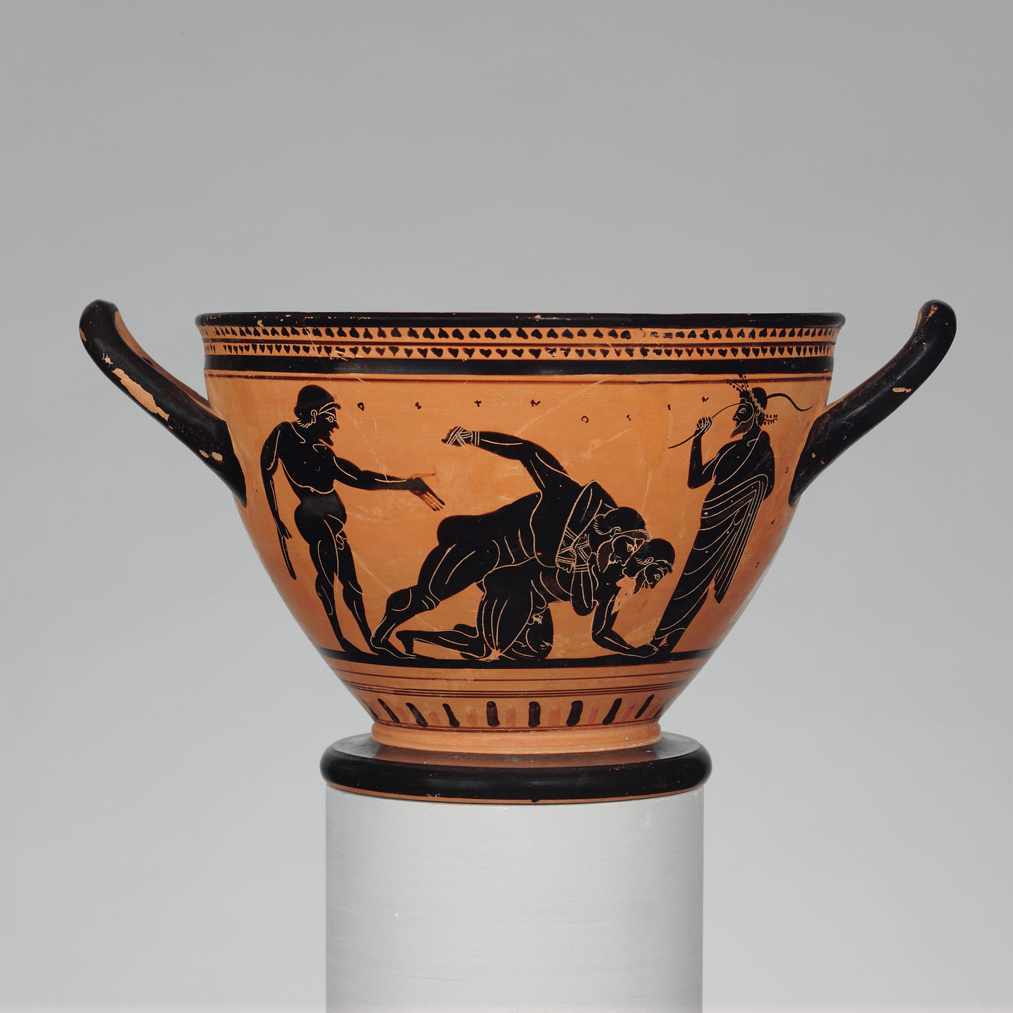 The drinking cup pictured below, crica 500 BCE, is thought to depict the Pankration, a Greek sport that might be considered a distant ancestor of Ultimate Fighting, combining elements of kickboxing and wrestling. Here, the athletes compete under the eyes of a trainer and spectator.